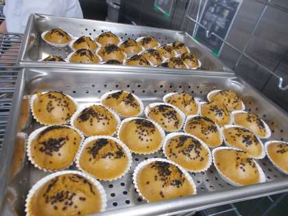 デザートには黒糖蒸しパンを出しました。黒糖の風味と黒ゴマの飾りがアクセントになったふんわりもちもちの蒸しパンです。