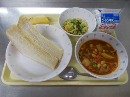今日の主食は『ハムチーズトースト』です。厚切りの食パンに、からしバターマヨ・ハム・チーズを挟んで、オーブンで焼き上げたホットサンドです。