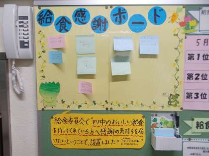 給食委員会で“おいしい給食を毎日作ってくださっている方々へ生徒の声を届けたい”という素敵な意見が上がり、『給食感謝ボード』を給食室前の掲示板へ設置しました。全校生徒が自由に給食の感想や感謝の言葉を書き込めるものです。