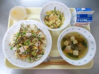 ・麻婆豆腐丼・中華和え・じゃがいもとわかめのスープ・牛乳 今日の副菜は中華和えで...