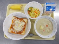 ・ピザトースト・さつまいものシチュー・コーンサラダ・バナナ・牛乳 今日の給食の主...