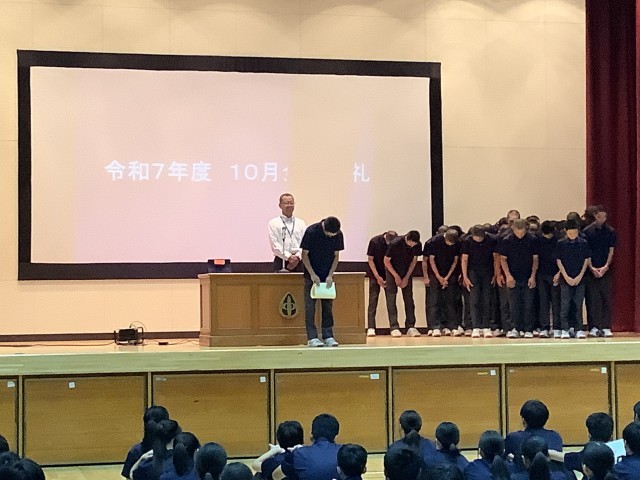 朝礼に先立ち、野球部が大会での活躍を讃えられ、全校の前で表彰を受けました。仲間の努力と成果を称える拍手が体育館いっぱいに広がり、温かい雰囲気の中で朝礼が始まりました。
