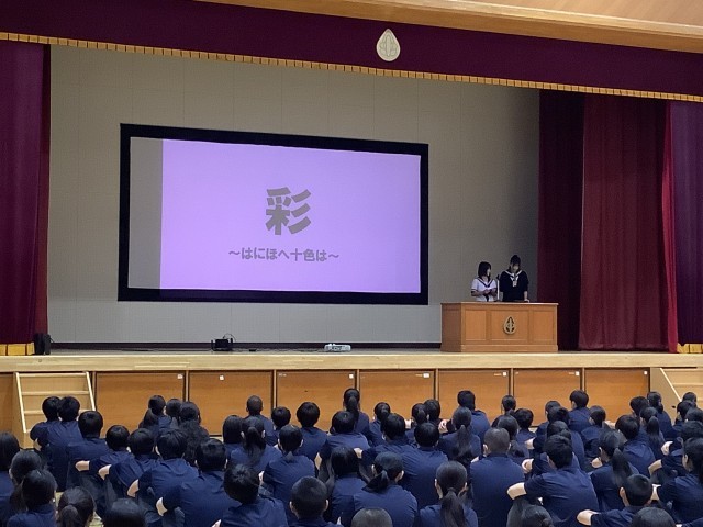 朝礼の最後には、文化祭実行委員から秋桜祭のスローガンが発表されました。実行委員の力強い発表に、会場は大きな拍手に包まれ、文化祭に向けた意欲が一層高まる時間となりました。