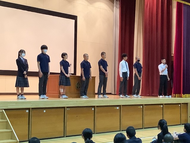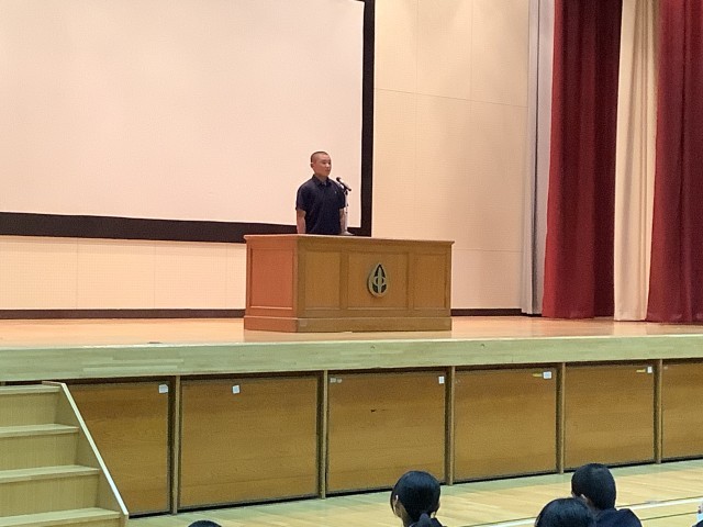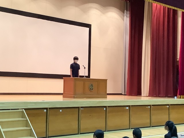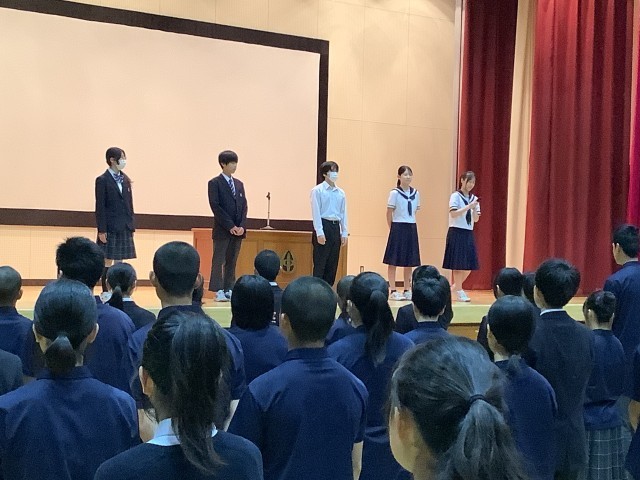 10月14日(火)、後期最初の生徒会朝礼が行われました。旧生徒会役員と新生徒会役員、そして新たに選出された専門委員会委員長から挨拶があり、後期の活動への意気込みが語られました。その後、図書委員会と生活委員会からお知らせがあり、生徒たちは新しい体制のもとでの学校生活のスタートを感じていました。