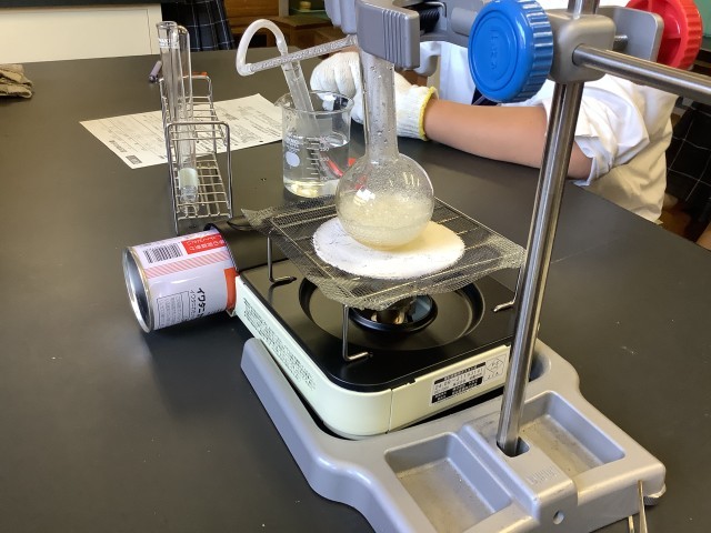11月28日(金)の理科の授業で、みりんを用いた蒸留実験を行いました。中学1年生が取り組む化学実験の中でも難易度が高く、1分ごとの温度測定や、出てきた気体の性質を調べるなど、実験内容の理解力が求められる活動です。