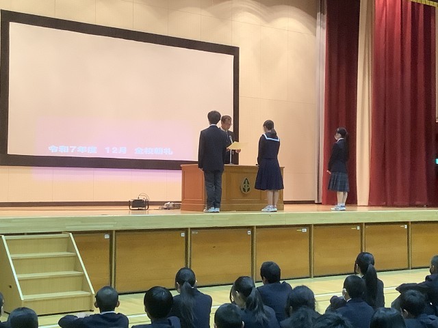 12月1日(月)に全校朝礼が行われました。はじめに、読書感想文と弁論大会の表彰が行われ、代表生徒が壇上で賞状を受け取りました。