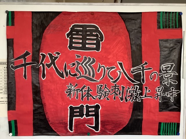 スローガンと背景に描かれた雷門のイラストがよく調和し、目を引く大変完成度の高い作品となっています。ポスターは、校外学習実行委員が昼休みの時間を活用し、少しずつ丁寧に仕上げてきたものです。