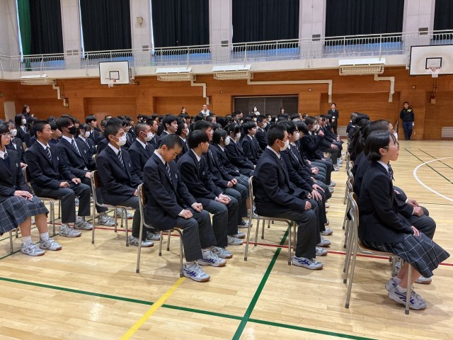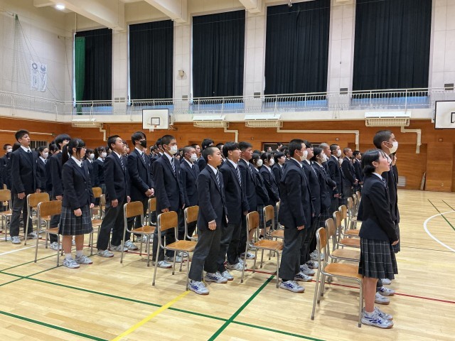 その後、起立や着席などの所作の確認を行うとともに、校歌などの歌の練習を行いました。卒業式に向けて、在校生としてふさわしい態度で式に臨めるよう準備を進めました。