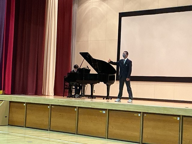 練習のはじめに、2年生の学年主任から話がありました。卒業式はおごそかで礼儀を大切にした雰囲気の中で臨むことが大切であること、また式の最中には言葉で思いを伝える場面は少ないため、校歌などの歌に気持ちを込めて卒業生に思いを伝えることが大切であるという話がありました。