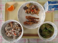 菜の花御飯は小松菜の「緑色」といり卵の「黄色」を混ぜて菜の花を表現しています。この御飯は春の彩りの混ぜ御飯です。上中では、江戸川区内の新鮮な小松菜を納めて頂き、調理師さんに美味しく調理をして頂いています。きんぴらもさつま汁も