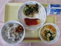 ≪今日の給食≫*麦ご飯*カルちゃんふりかけ*ぎせい豆腐*からし和え*切干大根のみ...