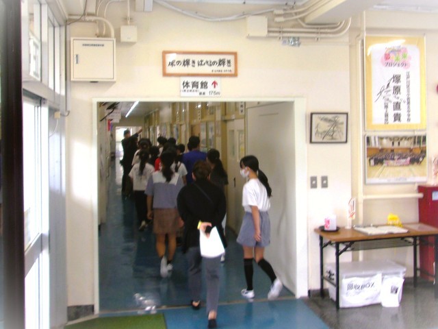 最初に校長先生のお話を聴いているときは少し緊張した面持ちでしたが、広い校舎内を巡り、再び柔剣道場に戻ったときには(ややくたびれていましたが)少しリラックスしていたようです。