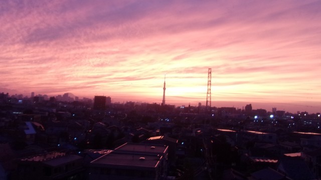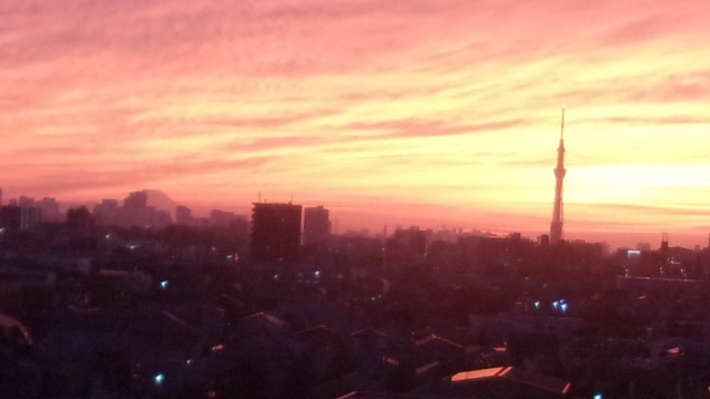 そこで見たのは、うわさに聞いた、そして初めて目にした「富士山とスカイツリーのコラボ」でした。写真でわかるでしょうか?左の方にピラミッドのようなシルエットで映っているのが富士山です。(ちなみにプールに異常はありませんでした)