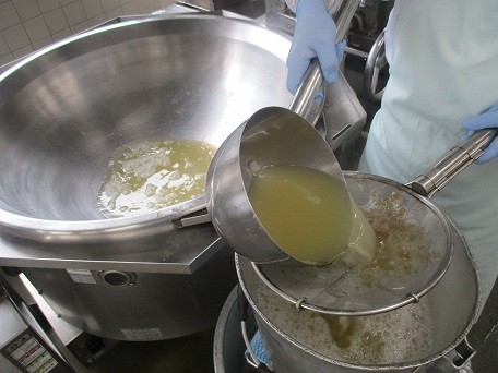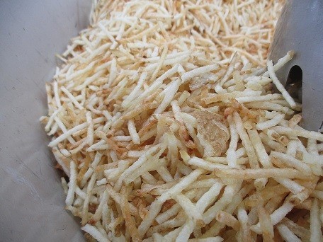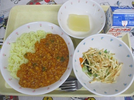 これに関連して、今日の給食は「みんなの給食 給食からSDGsを考える」として、大豆が原料の高野豆腐を使ってカレーを作ったり、フライドポテトのじゃがいもを皮つきのまま使ったりしました。[写真3:フライドポテトは、しっかり油をきってよく冷ましてから配缶したので、生徒のみなさんが食べるころにもカリカリをキープできていたと思います🥔]