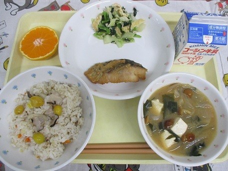 今日は、二十四節気の「霜降」という日です。朝晩の冷え込みがさらに増し、北のほうの地域や山では霜が降りはじめるころで、だんだんと冬が近づく季節の変わり目です。そんな今日の給食は季節の献立として、旬の食材や秋の料理を取り入れました。
