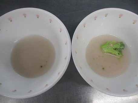 [写真3]わかりにくいですが、給食室で実験した結果です。左が元のスープ/右がマリネのブロッコリーを浸したもの。右のほうが心なしか鮮やかに発色して桃色っぽく見えるような・・・?