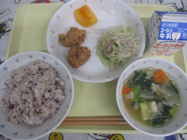 給食試食会では、小岩五中で大人気の「とり肉のから揚げ」をメインとして、11月が「和食月間」であることから、“主食・主菜・副菜・汁物・その他(果物)”が揃った、和食の献立としました。小岩五中自慢の栄養満点の給食、いかがだったでしょうか?