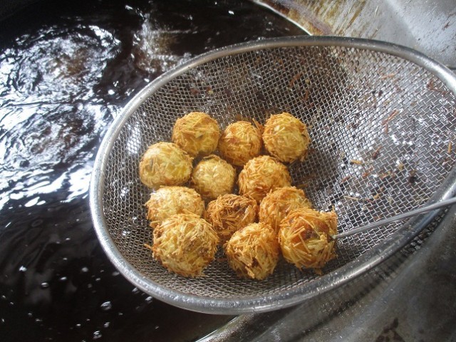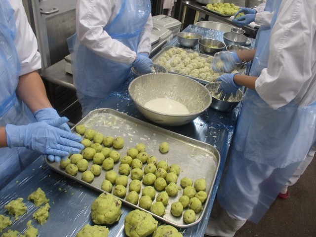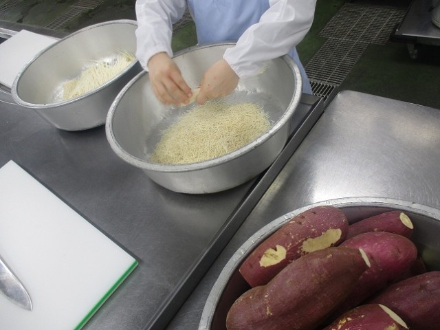 また、季節感といえば、秋から冬にかけてが旬の「いがぐり」も献立に取り入れてみました。……といっても、本当にトゲトゲした“いが”のついた栗ではなく、「そうめん」でいがを・食べごろの旬をむかえている「さつまいも」で中身を表現して、本物に似せて作った料理です。