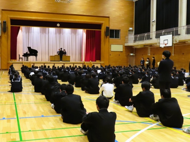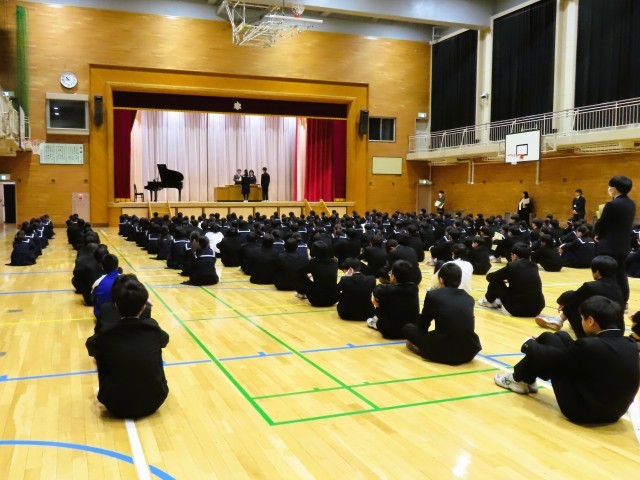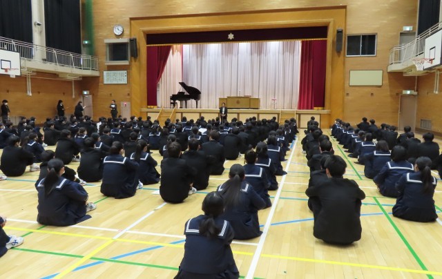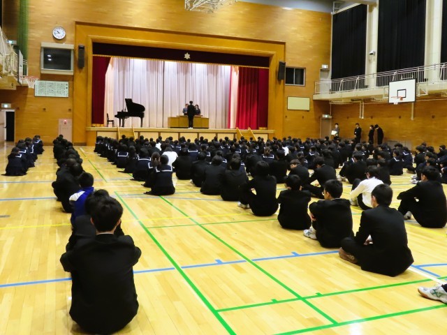 初めに、数検、卓球、税の作文の表彰の後、終業式で校長先生のお話があり、続いて離任式が行われました。
