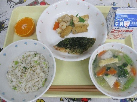 そんなわけで、この日に関連して、今日の給食は今まさに旬をむかえている「ぼら」や「みかん」、「大根」、「小松菜」などの食材を使いました。