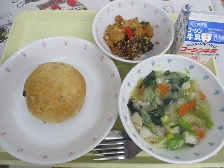 今月の手作りパンは、ハムとチーズをたっぷりと練り込んだパンです!朝早くから、調理員さんたちが一生懸命パン生地をこねて、外はカリカリ、中はもっちりとした、小さいながらもボリュームたっぷりの岩五給食室特製手作りパンを作ってくれました。