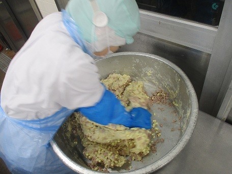 そんな手作りパン、小岩五中では1回に300個くらい作ります。一気に作るのは大変なので、材料を3つ(約100個分ずつ)に分けますが、これを1つにつき約20分間こね続けて生地を作っています。