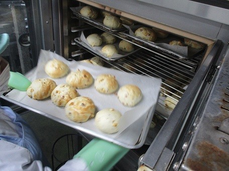 普段の調理パンは、具を作ってのせたり・はさんだりするのは給食室で行い、パン自体はパン屋さんに注文していますが、手作りパンの日はパン生地から給食室で手作りしているので焼き立ての食感や風味が豊かなパンを味わうことができます。