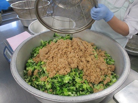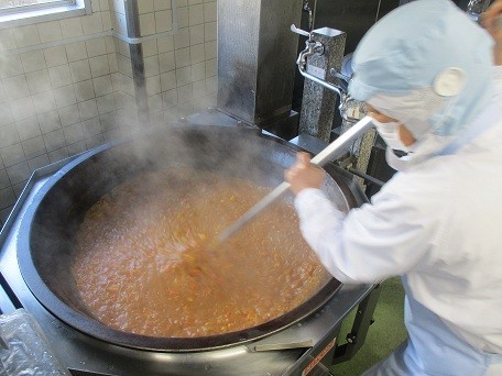 これに関係して、今日の主食はもちろんカレーライスにしました。今年のリクエスト給食でも、ほとんどの学年・クラスで3位以内にランクインするほど大人気でした。今回は豚の角切り肉で作りました。