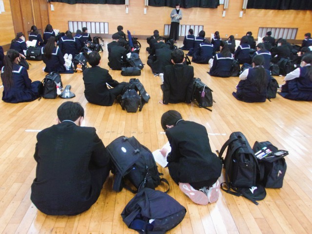 1月23日の校外学習(都内めぐり)に向けて、体育館1階柔剣道場において、1年生は前日指導を行いました。