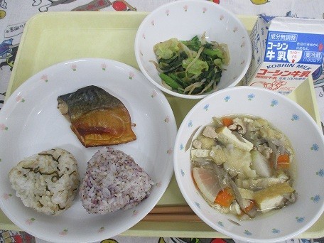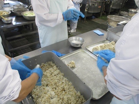 再現したといっても、本来は「おにぎり(塩むすび)・焼き魚・漬け物」のシンプルな内容のものを、栄養価などの都合で、おにぎりに味を付けたり汁物を追加したりとだいぶ豪華にアレンジしてしまいましたが……、“当時の子どもたちはこのような献立を食べていたんだなあ”と思いを巡らせてもらえたら嬉しいです。