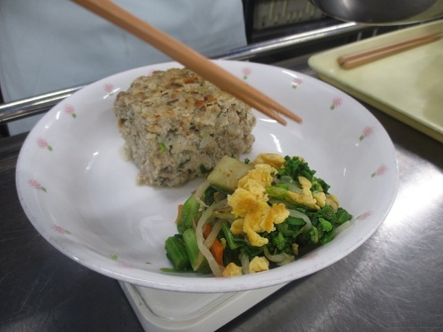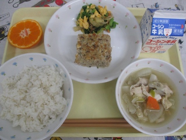 千葉県・安房地域では、古くから菜の花が生産されてきました。菜の花は、春を知らせる食材として千葉県の家庭で親しまれています。給食では、菜の花を混ぜ込んだご飯の上にいり卵を散らして、房総の菜の花畑をイメージした「菜の花の混ぜご飯」を作りました。
