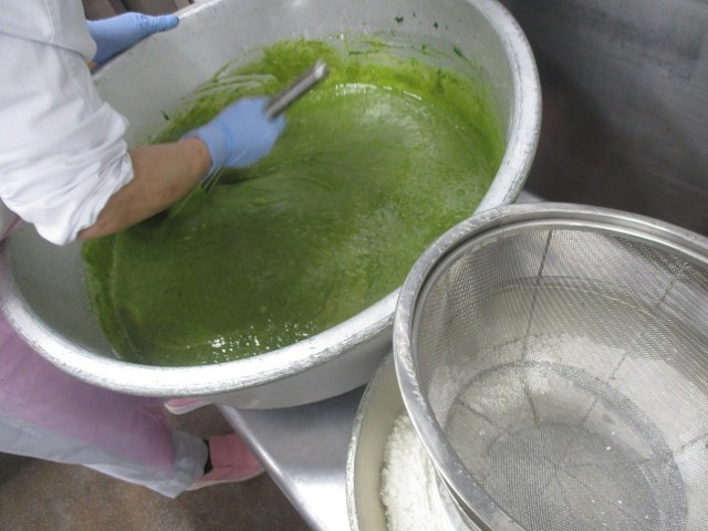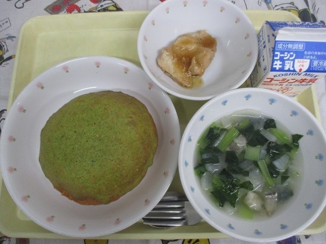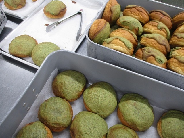 毎年のリクエストメニューで必ず上位に入る、大人気の「小松菜ビスキュイパン」の登場です!パンにジャムをはさんで、ペースト状にした小松菜を練りこんだ「ビスキュイ生地」を塗って焼きます。