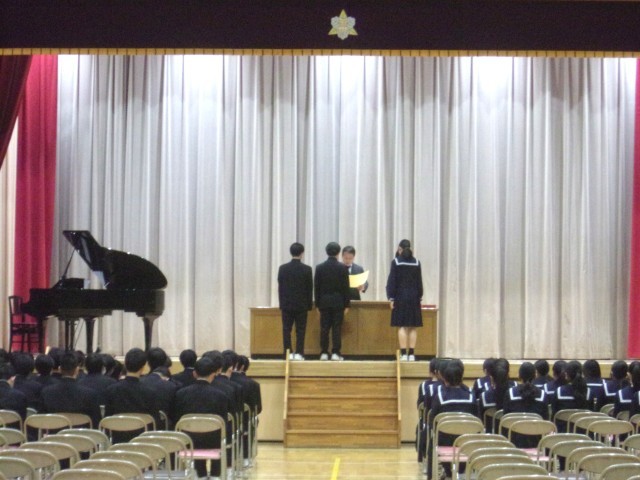 体育優良生徒や優良卒業生、健康努力生徒の表彰のほかに、英検・数検の表彰。そして、先日行った「数学・発想力コンテスト」の表彰を行いました。こちらは、1,2年生がベストテンにくいこみ、昨年度に続き会場が沸き上がりました。