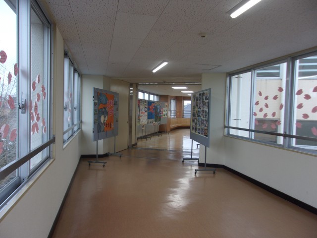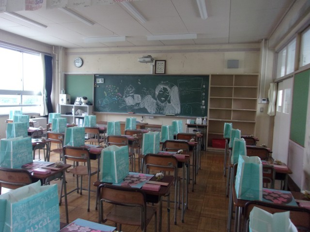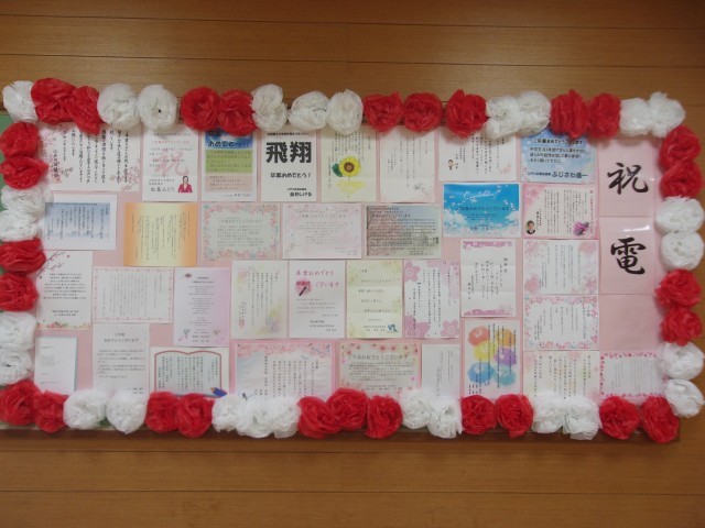 3月19日(木)朝、会場までの道(廊下)は、後輩たちの応援メッセージがかかれた桜が満開・・・続いて、卒業生の若いころ(1,2年生から)というよりは「幼さが残るあの頃」の無邪気な笑顔、そして、クラスで団結した象徴のクラス旗などが飾られていました。