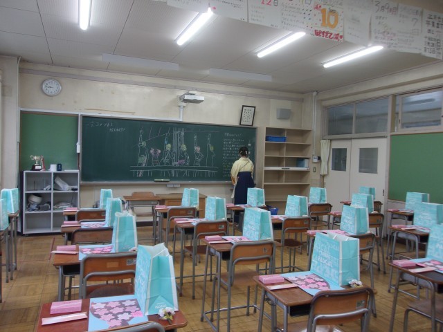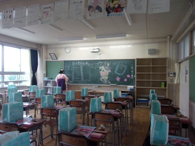 3年生の教室をのぞくと、鮮やかに装飾された黒板と、それに向かう鮮やかな「袴姿」・・・・