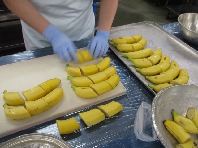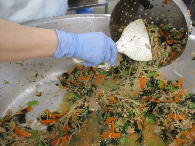 調理中の様子などを写真で紹介していきます。写真3はサラダの水分をよ~くきっているところです。これも岩五の給食の美味しさの秘訣です。