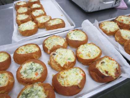 パンの上部を切り、下の部分のパンをくり抜き、空洞にします。くり抜いたパンと具材、ホワイトソースを合わせ、再度パンの中に詰めます。パンに詰めた後、チーズをトッピングして焼き、最後にパンの上部で蓋をして出来上がりです。