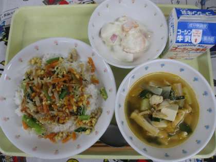 ビビンパは、日本でも広く知られているとおり韓国の料理です。正しくは「ビビン・パプ」と発音し、“混ぜあわせる・ご飯”という意味があります。韓国では手軽な料理として食堂や家庭でよく食べられています。今日はしょうゆ味で炒めた肉・卵・野菜に、みそだれもかけて、二つの味を楽しめるように仕上げました。