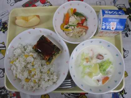 「学力向上週間」の給食・三日目の注目すべき料理は「ホウレン草のオムレツ」です。