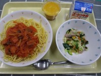【献立】鮭のトマトクリームスパゲティキャベツフレンチサラダカボチャプリン 今日の...