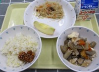 【献立】きびごはん大豆入り鉄火味噌春雨と野菜の炒め物若鶏とこんにゃくの味噌煮果物...