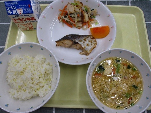 今日の給食の「鰆の梅味噌焼き」は、鰆を白味噌、練り梅、みりんなどの調味料に漬け込み、オーブンで焼きました。梅と味噌のたれが香ばしく、鰆とよく合います。