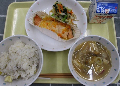 今日の給食の「鮭のもみじ焼き」は、鮭に、にんじん、ねぎの粗みじんととうもろこしとマヨネーズを加えたたれを乗せ、オーブンでこんがりと焼きました。野菜の甘さが鮭とよく合います。