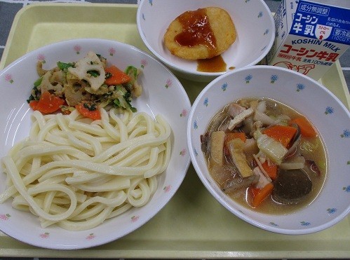今日の給食の「ちゃんこうどん」は鶏肉、つみれ、ちくわなどの具材とごぼう、大根、えのきたけ、白菜などの沢山の野菜を使用したつけ汁にうどんの麺をつけて食べます。具材のうまみが濃縮したスープとうどん麺がよく合います。