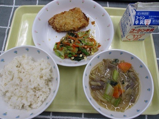 今日の給食の味噌汁は、豚肉と玉葱、こんにゃく、ごぼうなどの具を使用しています。様々な具材をごま油で炒め、削り節でとっただしを加えています。