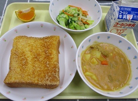 今日の給食のフレンチトーストは、卵とバター、牛乳を合わせた卵液につけ、きなこをまぶした食パンをオーブンで焼きました。卵ときなこの風味がよく合います。