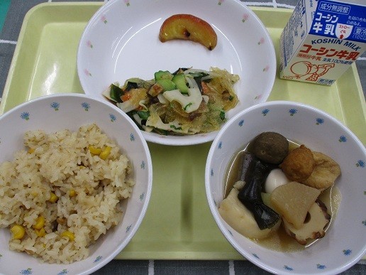 今日の給食の「姫路おでん」は、生姜醤油をつけて食べるおでんです。給食では、大根、じゃがいも、こんにゃく、揚げボール、はんぺん、がんも、うずらの卵などの具材をじっくりと煮込み、最後に生姜醤油を加えて仕上げています。生姜のぴりりとした風味が寒い季節にぴったりです。