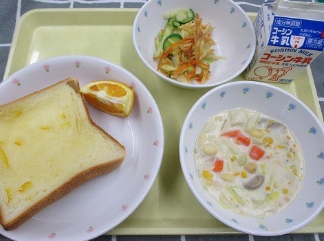 今日の給食の「ビーンズチャウダー」は、大豆、白いんげん豆、ひよこ豆、3種類の豆が入ったチャウダーです。白菜、じゃがいも、にんじんなどの野菜もたっぷりと入り、寒い日にぴったりの料理です。