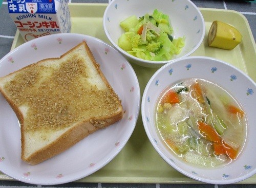 今日の給食の「セサミハニートースト」は、3年6組のリクエスト給食です。白ごま、白すりごま、バター、はちみつを合わせたペーストを食パンに塗って焼いています。ごまをたっぷりと美味しく食べることができるメニューです。