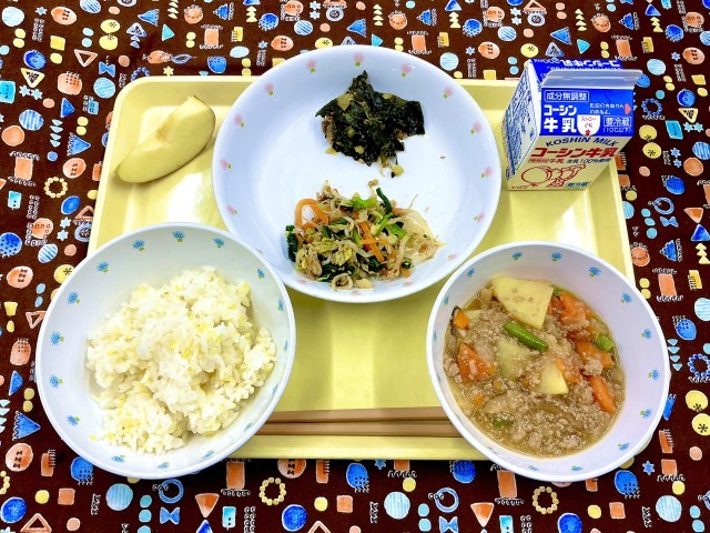 もちきびご飯 わかめのジュージュー 野菜のしらす和え じゃが芋のそぼろ煮 りんご